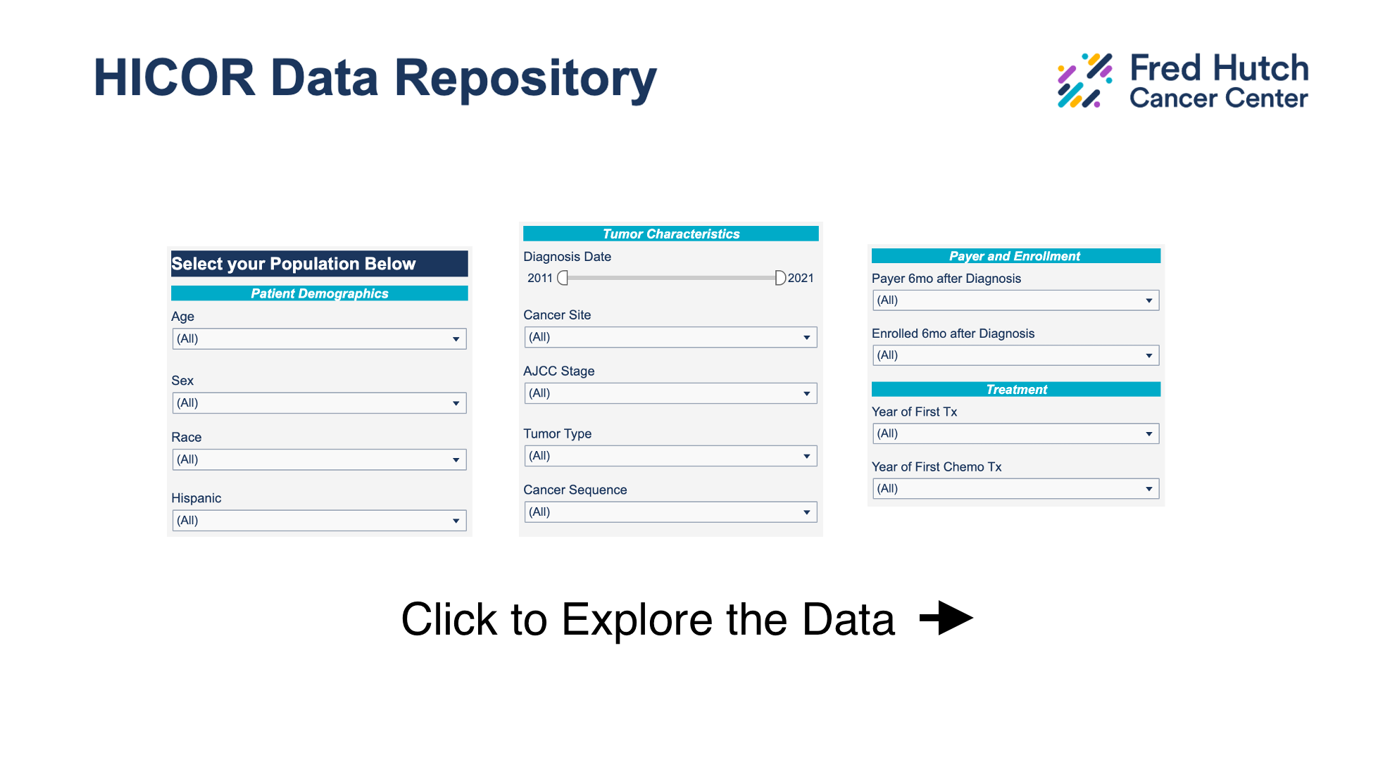 The HICOR Population Explorer Tool can be used to determine if a population of interest is available within the HICOR Data Repository. Use the tool to interactively explore and filter data.